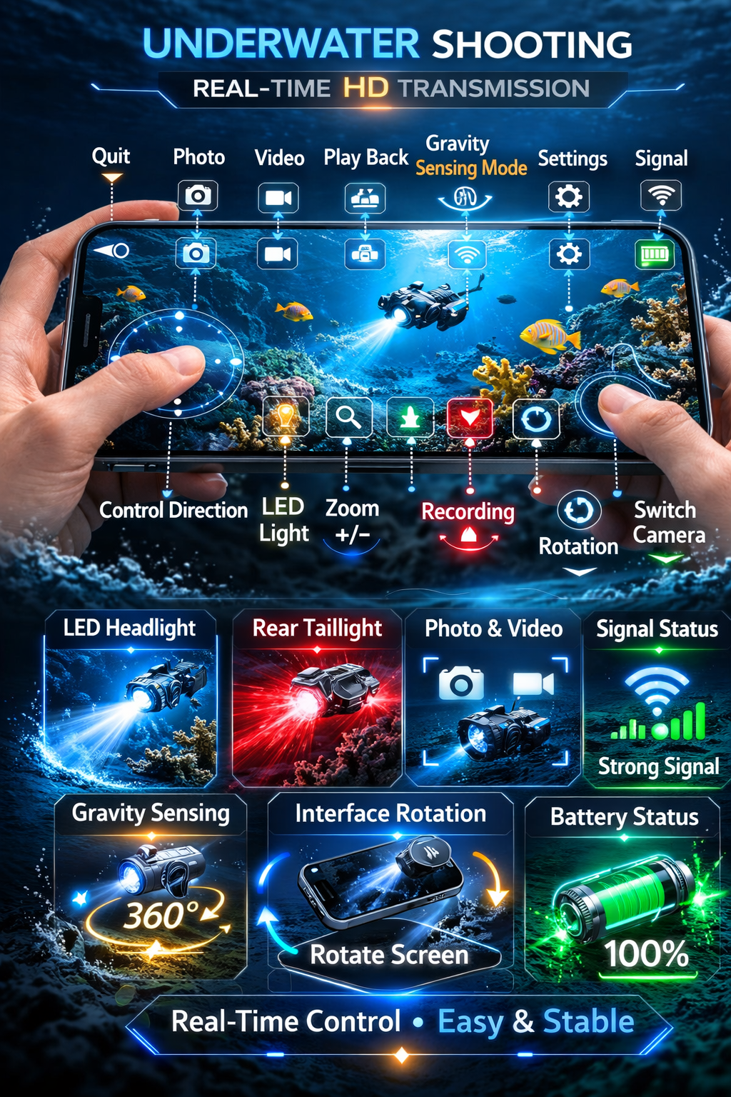 Forward, backward, left turn, right turn, camera (10 meters), camera, real-time transmission,